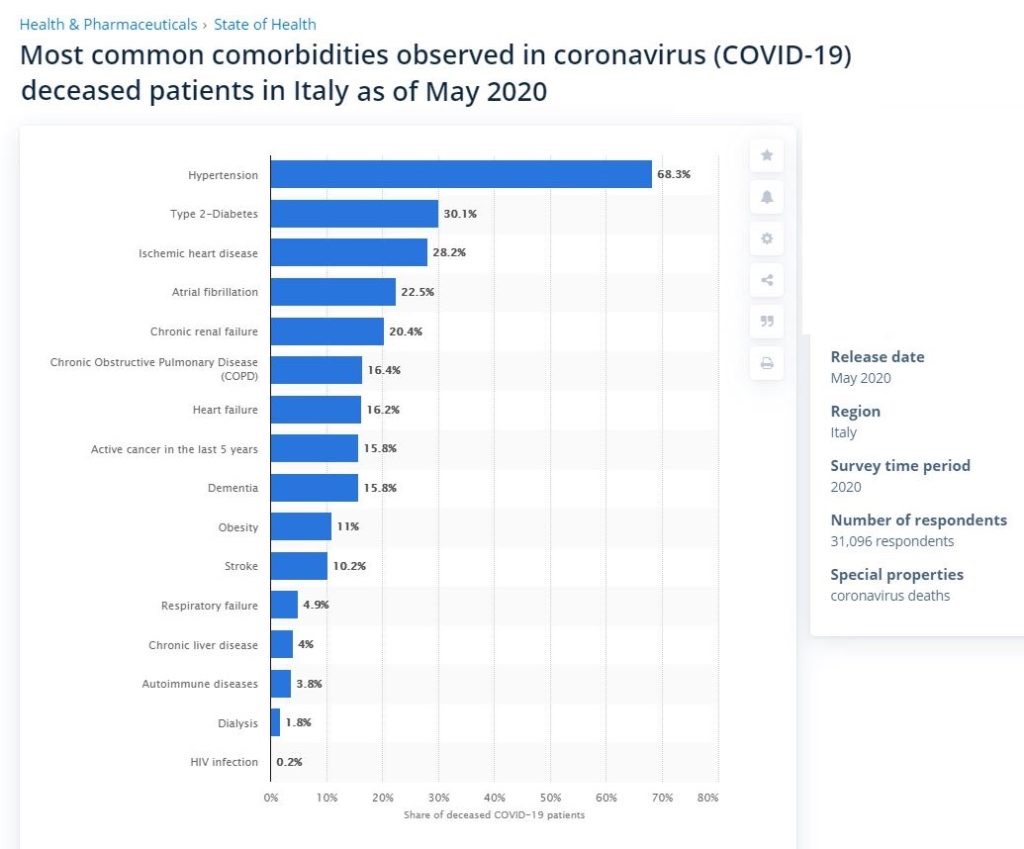 El número medio de comorbilidades entre todas las muertes italianas por coronavirus fue de 3,1, reveló la ISS. Solo el 15 por ciento de las muertes ocurrieron con la presencia de solo otra patología grave, mientras que el 21,4 por ciento murió con otras dos patologías y el 59,6 por ciento con tres o más patologías.