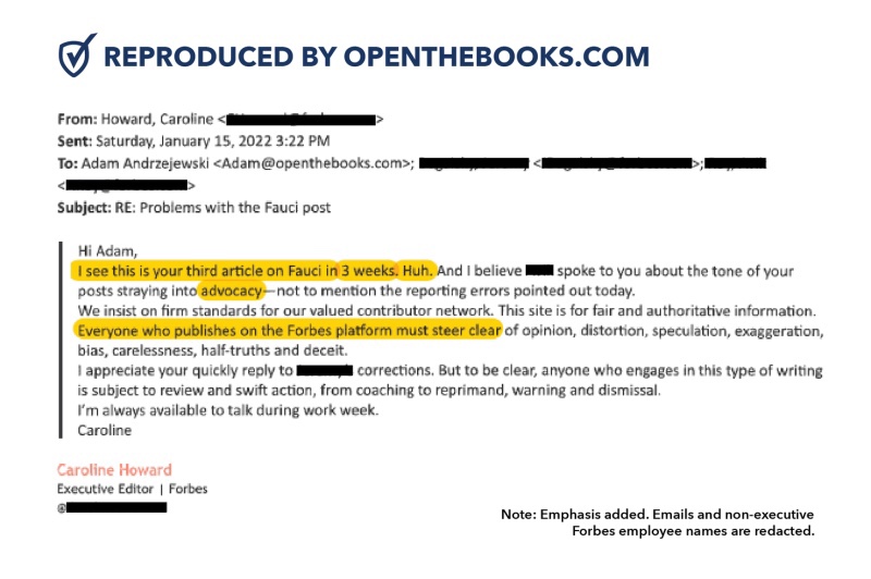 Comenzó un correo electrónico de la editora ejecutiva de Forbes, Caroline Howard, a Andrzejewski con fecha 15 de enero de 2022: «Veo que este es su tercer artículo sobre Fauci en 3 semanas. Eh”. Howard luego acusó a Andrzejewski de defensa, en lugar de periodismo.