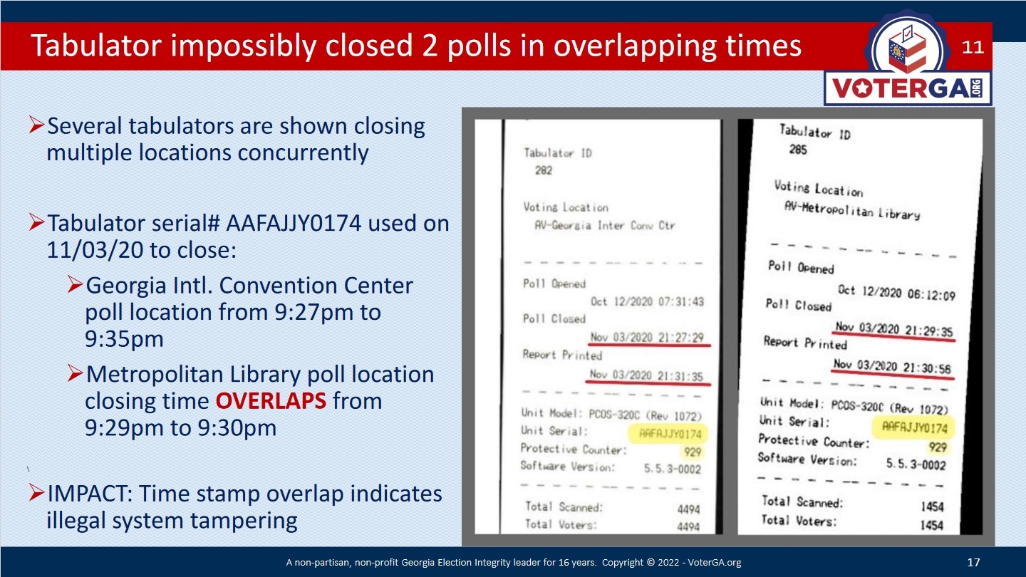 Garland Favorito de VoterGA.org proclama: «Si esta no es la pistola humeante, no sé qué es». (1:21:10) Literalmente, cada voto en el condado de Fulton tiene algún tipo de problema de manipulación. Sabemos que las papeletas reales (en papel) no van a sumarse a los resultados de las elecciones. Llevo 40 años en el negocio de los ordenadores informáticos de TI. Estos no son errores técnicos. Esto es la inserción electrónica. Las imágenes (boleta) se manipularon electrónicamente. Realmente no puede haber ninguna disputa al respecto».