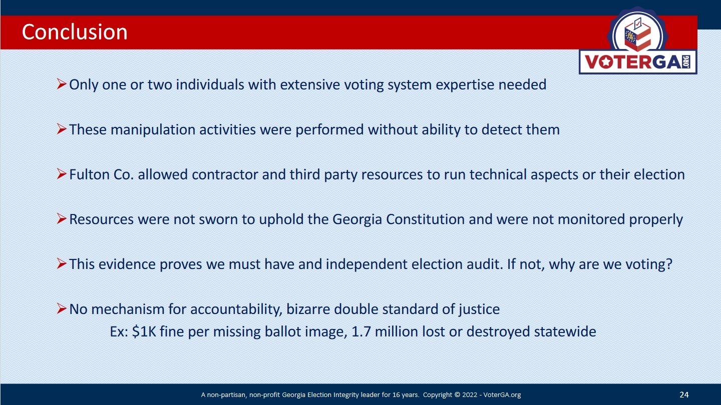 Utilizando las leyes de solicitudes de registros abiertos y el descubrimiento legal, VoterGa solicitó imágenes de papeletas en todo el estado de Georgia. Durante la presentación, se explicó que el condado de Cobb destruyó todas sus imágenes de papeletas (archivos TIF) y toda la autenticación (SHA) para esas imágenes. Dicen que el condado de Gwinnett y otros podrían ser peores. Esto viola las leyes federales (22 meses) y estatales de retención (24 meses) para los registros electorales. (1:07:20) Los secretarios del condado dicen que el ex director de elecciones del Secretario de Estado Chris Harvey les dijo que podían destruir estos registros. En un correo electrónico, Harvey también dijo que pueden sobrescribir las tarjetas de memoria, que también almacenan imágenes de papeletas.