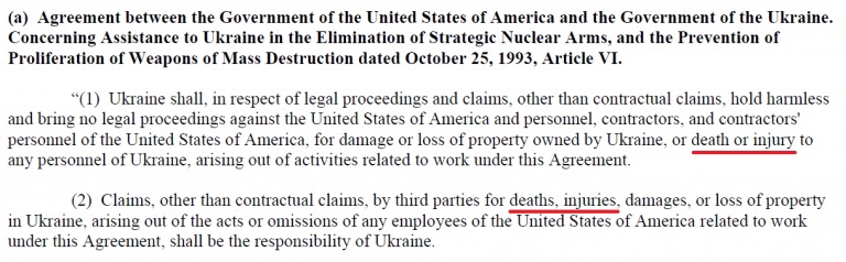 Además, de acuerdo con el Acuerdo entre Estados Unidos y Ucrania, las reclamaciones de terceros por muertes y lesiones en Ucrania, que surjan de los actos u omisiones de cualquier empleado de los Estados Unidos relacionados con el trabajo en virtud de este Acuerdo, serán responsabilidad de Ucrania.