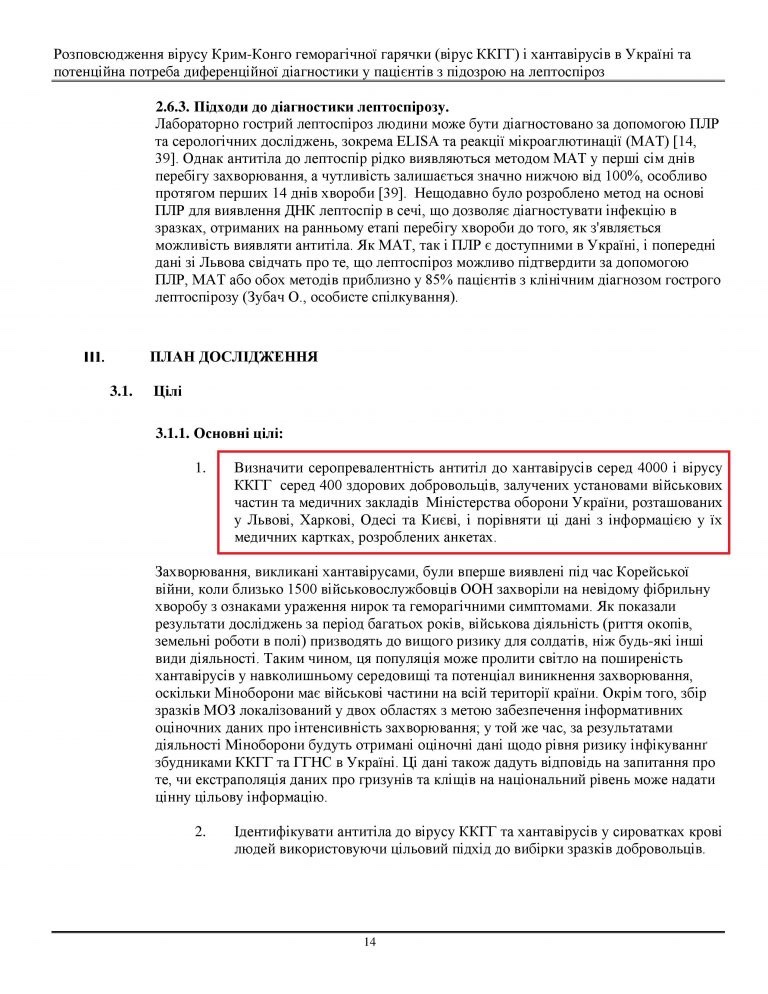 Según la descripción del proyecto, se recogerán muestras de sangre de 4.400 soldados sanos en Lviv, Jarkov, Odesa y Kiev. 4.000 de estas muestras se analizarán en busca de anticuerpos contra hantavirus, y 400 de ellas, para detectar la presencia de anticuerpos contra el virus de la fiebre hemorrágica de Crimea y Congo (CCHF). Los resultados de los análisis de sangre no se proporcionarán a los participantes en el estudio.
