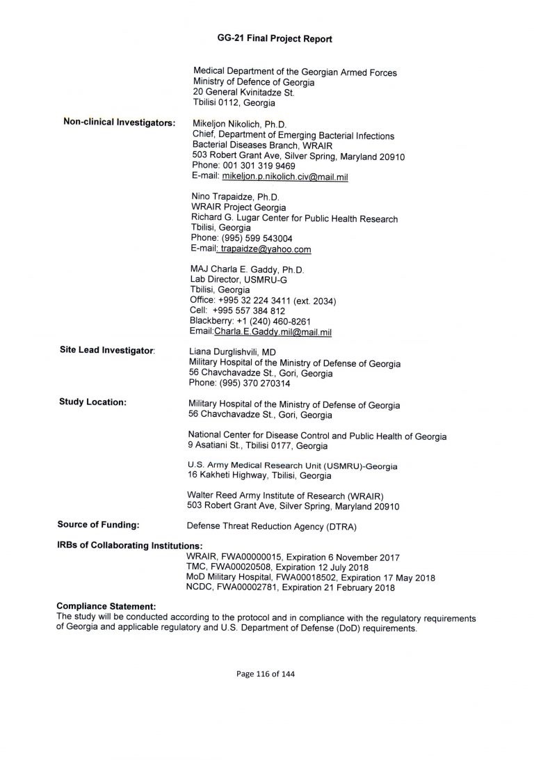 El Pentágono ha puesto en marcha un proyecto de 5 años con una posible extensión de hasta 3 años con el nombre en clave GG-21: «Infecciones zoonóticas y transmitidas por artrópodos entre el personal militar de Georgia». Según la descripción del proyecto, se obtendrán muestras de sangre de 1000 reclutas militares en el momento de su examen físico de registro militar en el hospital militar georgiano ubicado en Gori.