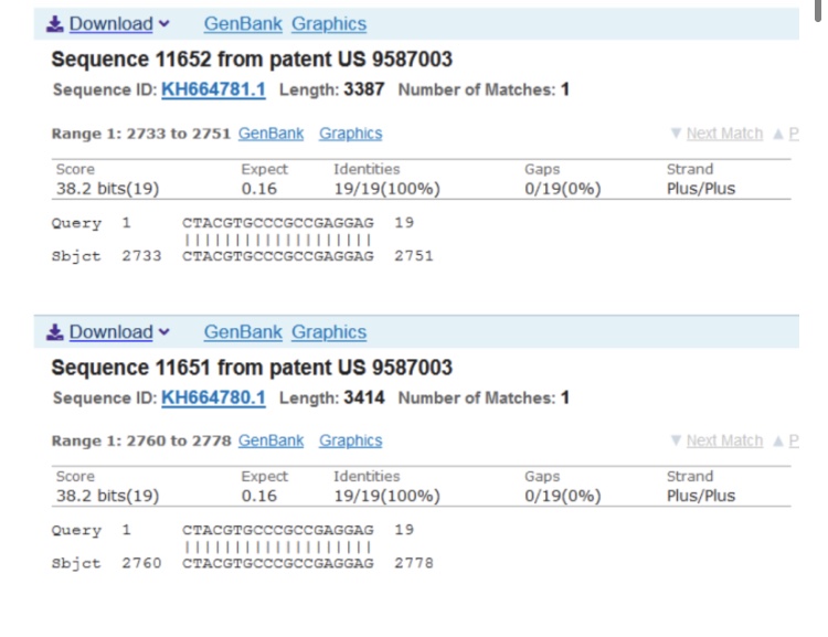 Decidí comprobar su trabajo. Sí. De hecho, los he comprobado (enviaré una factura a los globalistas). Este resultó ser un viaje un poco épico. La página de patentes de Google para US9587003B2 no contiene la secuencia genética. El pdf de la patente no contiene la secuencia genética y no se puede buscar en las páginas 101-304. Pero tiene un enlace a una larga sección de «Listado de secuencias» cuyo enlace no se puede copiar. Así que lo transcribí manualmente en mi buena mano: http://seqdata.uspto.gov/? pageRequest=docDetail&DocID=US09587003B2