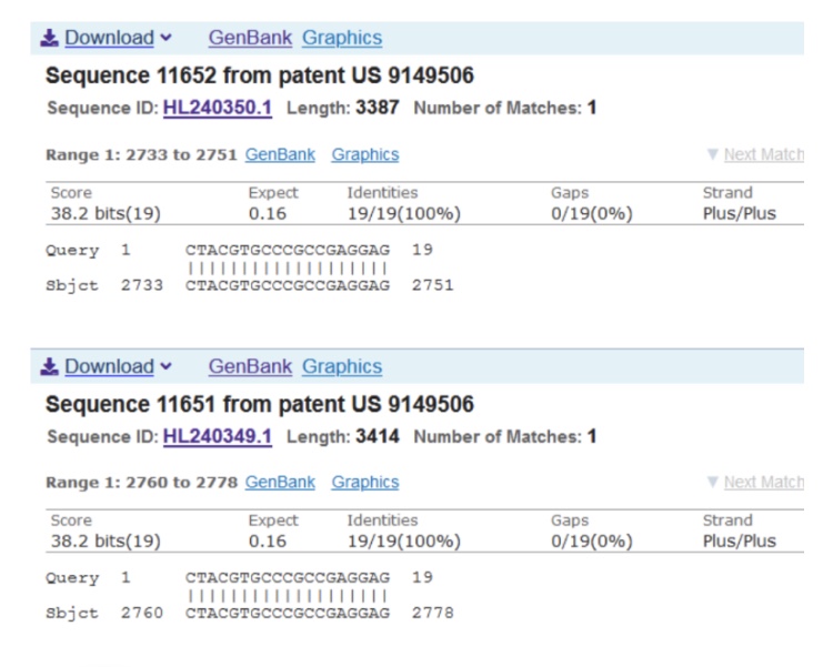 Los investigadores hicieron una búsqueda de alineación BLAST (Basic Local Alignment Search Tool) (lo que significa que buscan la secuencia de genes, la secuencia de genes inversa, la secuencia de genes complementarios y la secuencia de genes de cortesía inversa) a través de cada secuencia de genes en la naturaleza conocida por el hombre para CTCCTCGGCGGGCACGTAG, que es la secuencia de 19 nucleótidos que contiene la secuencia de escisión Furin, que también aparece en Covid-19, y que se encuentra en realidad en la forma de complemento inversa CTACGTGCCCGCCGAGGAG patentada por Moderna.