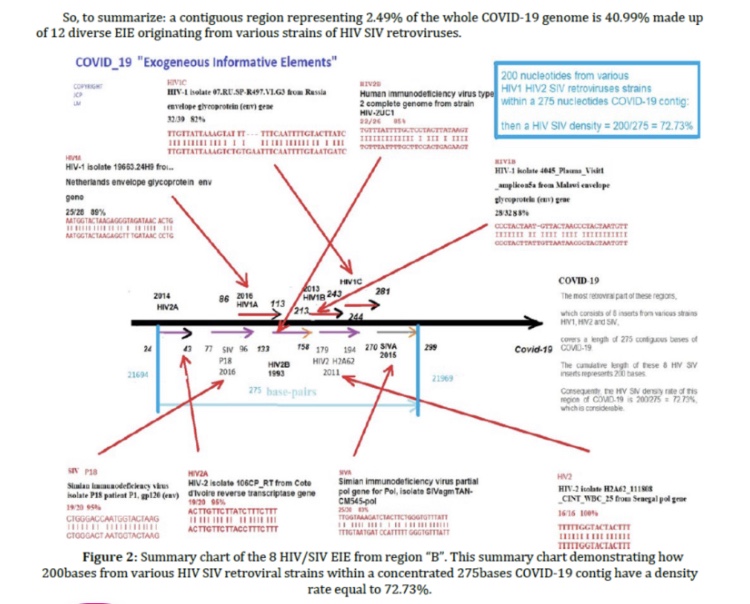 El profesor Luc Montagnier, antes de morir en 2022 febrero8, hizo un asesinato total del concepto de que el Covid-19 evolucionó naturalmente al demostrar que tenía una equivalencia masiva con el VIH. El siguiente diagrama muestra una región de 275 nucleótidos de Covid-19 que contiene 200 nucleótidos del VIH/SIV (SimunoVirus de Simia). Y recuerda que hay 61 codones que especifican 20 aminoácidos. Así que uno puede decir lo mismo en promedio de 3 maneras diferentes con los codones.