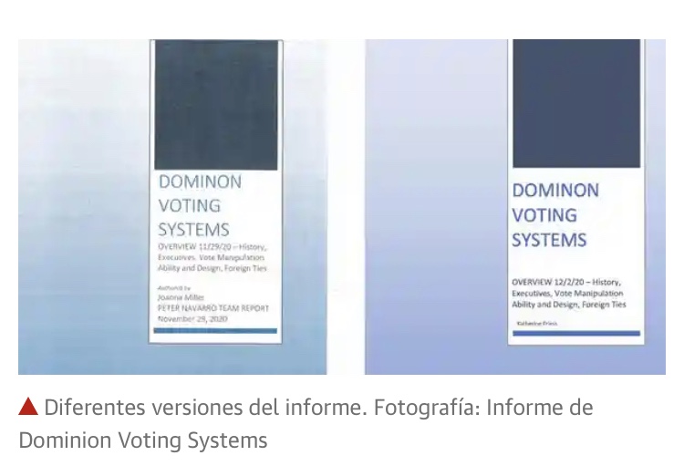 Pero, de hecho, el informe Dominion fue producido por la asistente principal de política de Trump en la Casa Blanca, Joanna Miller, según la versión original del documento revisado por The Guardian y una fuente familiarizada con el asunto, que habló bajo la condición de permanecer en el anonimato.