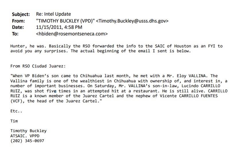 En 2011, Hunter Biden se reunió con Eloy Vallina, uno de los empresarios más ricos de Chihuahua, México, y suegro de Lucindo Carrillo Ruiz, un conocido miembro del Cártel de Juárez y sobrino de Vicente Carrillo Fuentes, el ex líder del Cártel de Juárez.