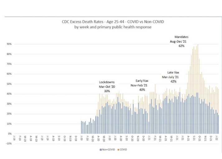 Como informó el Gateway Pundit el día de hoy, los datos más recientes de los CDC muestran que los millennials estadounidenses, de 25 a 44 años, experimentaron un aumento récord del 84 % en el exceso de mortalidad durante los últimos cuatro meses de 2021, según el análisis del experto financiero y denunciante de Blackrock, Edward Dowd, que apareció en la Sala de Guerra de Steve Bannon esta semana para discutir sus hallazgos.