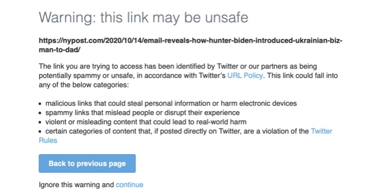 Twitter era aún peor. La empresa prohibió el New York Post de la plataforma y bloqueó la propia historia en Twitter. También prohibió a los usuarios de Twitter tuitear la historia e incluso enviársela unos a otros a través de un mensaje directo. Si uno encontró un enlace a la historia en Twitter, un clic trajo esta pantalla: