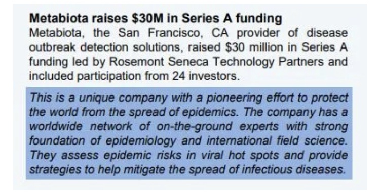 En 2017, Metabiota firmó acuerdos estratégicos con Munich Reinsurance Company e In-Q-Tel, Inc. («IQT»), el inversor estratégico que acelera el desarrollo de tecnologías para apoyar a la comunidad de inteligencia de EE. UU. Creada por la Agencia Central de Inteligencia («CIA») en 1999 como «la primera empresa de capital de riesgo patrocinada por el gobierno», IQT ha sido controvertida desde su creación.