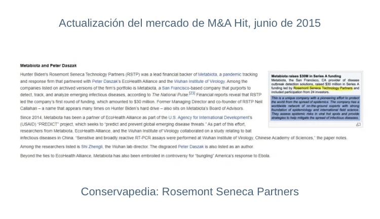 RSTP, Rosemont Seneca Partners y Rosemont Realty son vástagos de Rosemont Capital, un fondo de inversión fundado en 2009 por Hunter Biden y Christopher Heinz, hijastro de John Kerry. En 2015, 24 inversores financiaron Metabiota por valor de 30 millones de dólares, siendo RSTP el principal patrocinador financiero. El sitio web de RSTP, www.rstp.com, ya no existe.