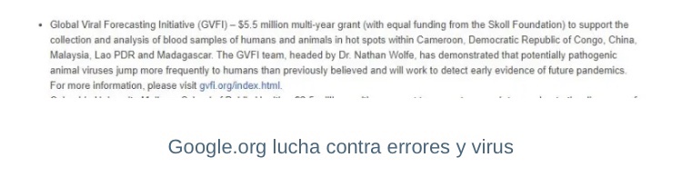 Wolfe también fundó la organización sin ánimo de lucro Global Viral y es director de la Global Viral Forecasting Initiative («GVFI»). En 2008, GVFI recibió 5,5 millones de dólares de Google y 5,5 millones de dólares de la Fundación Skoll «para detectar pruebas tempranas de futuras pandemias». «Queremos detener los virus muertos en sus huellas, sus huellas de animales, antes de que salten a los humanos», señaló el Dr. Mark Smolinski, Detective De Amenazas De Google.org.