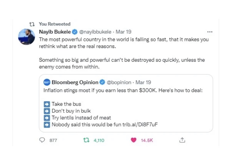 El domingo, el presidente de El Salvador, Nayib Bukele, publicó un comentario impresionante en Twitter.