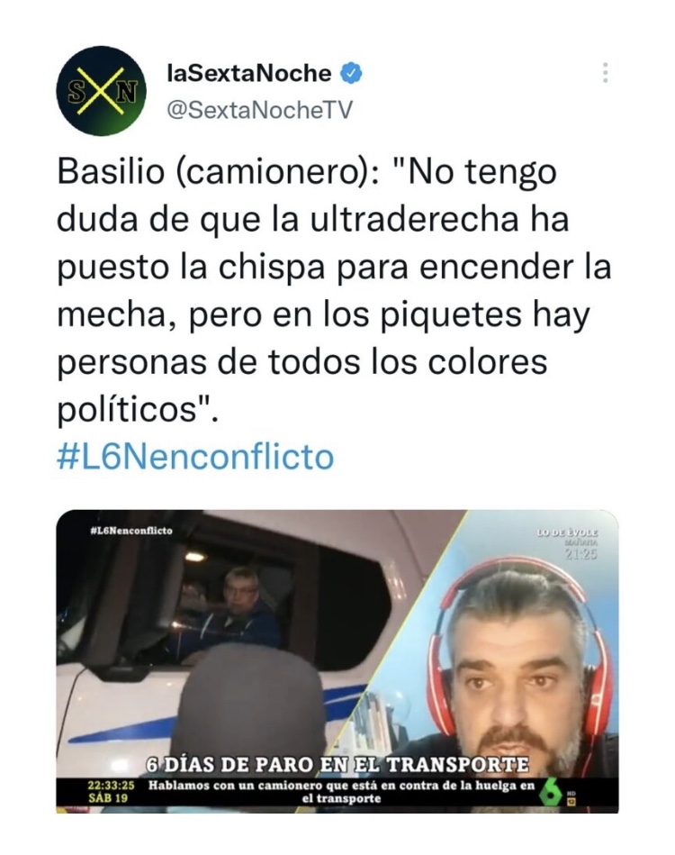 Pero hay veces que la manipulación de La Sexta es tan burda y descarada que se les pilla enseguida. Ahora tienen que estar en contra de la huelga de transportes porque, ya saben, son ultraderechistas, fachas y cientos de cosas más, solo porque pretenden defender su sustento.