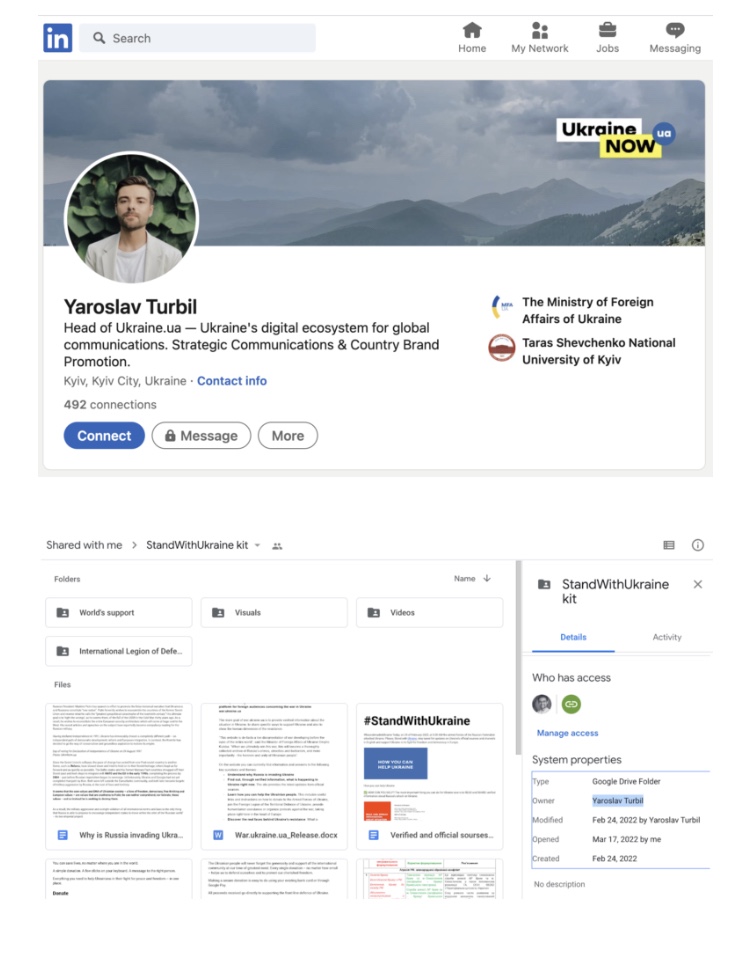 La carpeta está gestionada por Yaroslav Turbil, descrito en su página de LinkedIn como «Jefe de Ucrania.ua, el ecosistema digital de Ucrania para las comunicaciones globales. Comunicaciones estratégicas y promoción de la marca nacional». Turbil ha trabajado en múltiples organizaciones de la «sociedad civil» estrechamente vinculadas al gobierno de los Estados Unidos y ha internado en Internews, una organización vinculada a la inteligencia de los Estados Unidos que opera con el pretexto de promover la libertad de prensa.