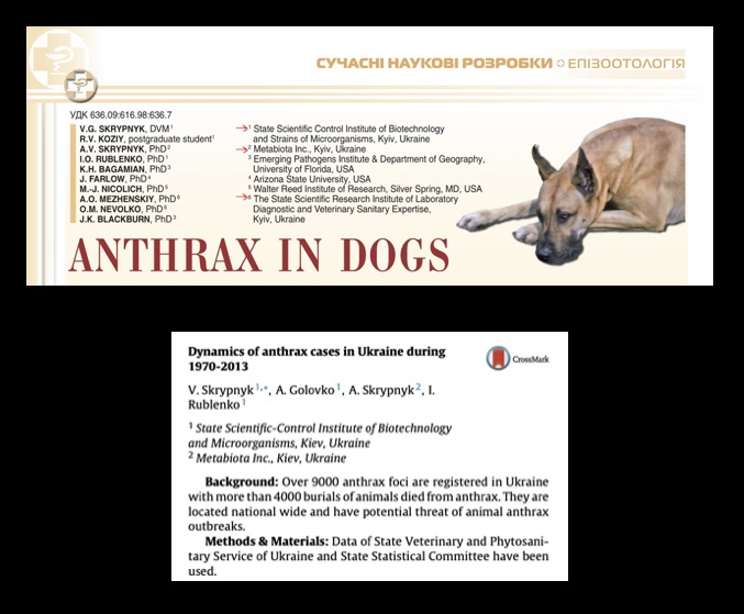 Skrypnyk también aparece como científico de Metabiota en otros artículos, incluyendo «Dinámica de casos de ántrax en Ucrania durante 1970-2013″, «Ántrax en perros» y «Vigilanciaerológica del ántrax en jabalí (Sus scrofa) en Ucrania».