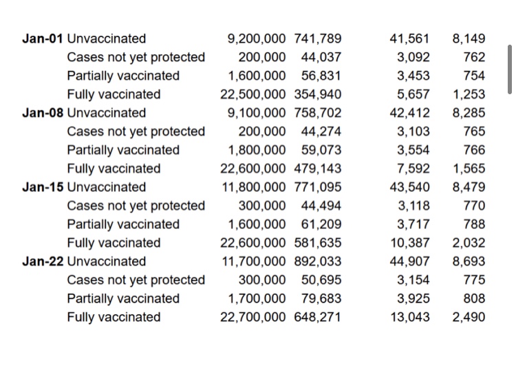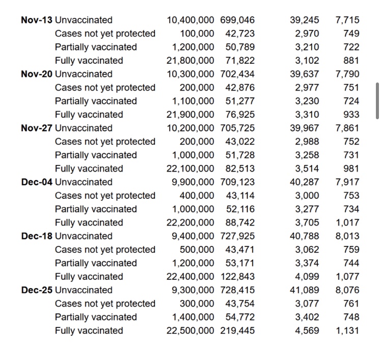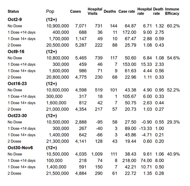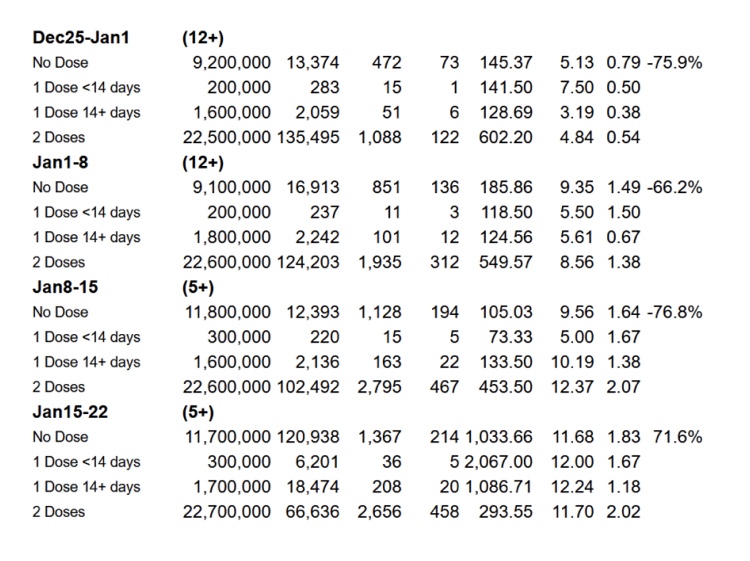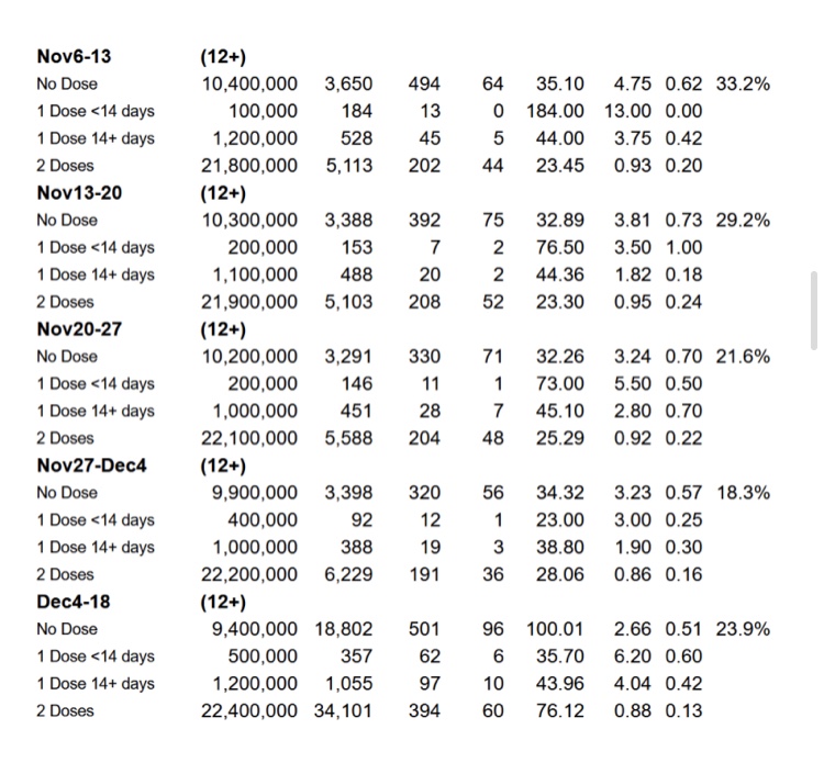 Aquí están los casos, hospitalizaciones y muertes por estado de la vacuna por semana (excepto en el período de 14 días del 4 al 18 de diciembre en el que se omitió el 11 de diciembre debido a que se preparó alrededor de Navidad, presumiblemente). Estos se deducen de la tabla anterior restando las cifras acumuladas de una semana de las cifras acumuladas de las semanas anteriores. Luego deducimos la tasa de casos, la tasa de visitas al hospital y la tasa de mortalidad por cada 100 000 de las cifras de población de la columna 2. Luego deducimos el porcentaje de eficiencia inmune/vacuna utilizando la fórmula normalizada de relación de tasa de casos de Pfizer.