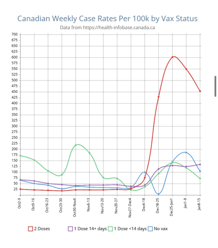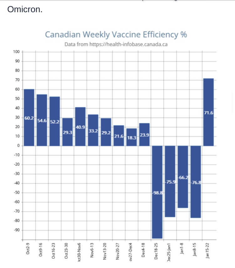 En la semana previa a la Navidad, cuando Omicron se atascó en Canadá, la eficiencia de la vacuna medida por la relación de tasa de casos normalizada entre el doblemente vaxxed y el novaxxed (que es como Pfizer lo midió en su ensayo seminal de la vacuna de fase III) pasó del +23,8% al -98,8% Hubo un factor navideño del -23,8 % en estas cifras, que luego se estabilizaron en el -75 %.