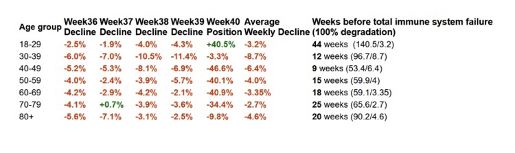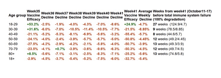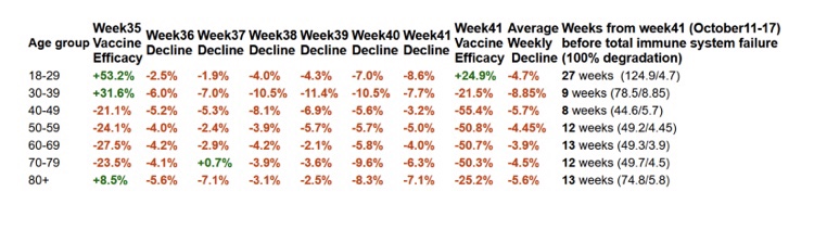 La eficiencia media de las vacunas en toda la tabla es (-2,9%-32,7%)/2 = -17,8% (82,2% por perder) y la tasa media de degradación semanal es del 5,4%. Por lo tanto, la tasa media de degradación semanal al 0% de eficacia de la vacuna (100% por perder) sería más alta en