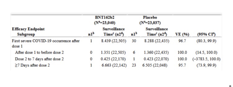 El VE contra la ocurrencia grave después de la dosis 1 fue de 1-1/30 = 29/30 = 0,966666 o 96,7 %