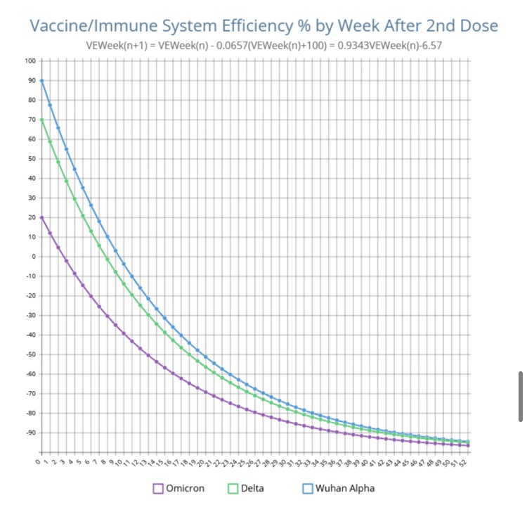 Estas cifras serán bastante precisas para la degradación del sistema inmunitario de 2 dosis. Si toma una tercera dosis, lo hará mejor durante tal vez 6 semanas, y luego se degradará a un ritmo más rápido y terminará peor después de tal vez 12 semanas.