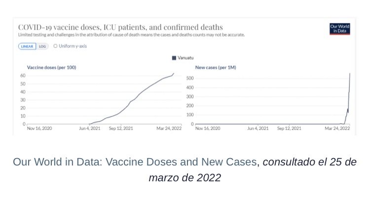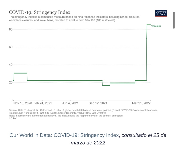 Según Worldometer, Vanuatu, con una población de 319.505 habitantes, ha tenido una muerte por Covid, el 23 de abril de 2021, durante todo el período de dos años de mediados de febrero de 2020 al 24 de marzo de 2022. Y Nuestro Mundo en Datos está de acuerdo. Sin embargo, el 8 de marzo de 2022 Vanuatu implementó de repente absurdas medidas de rigor.