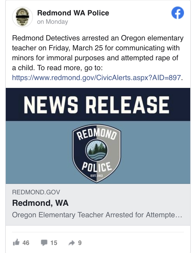 Los funcionarios anunciaron el lunes la detención de un profesor de primaria de Oregón «por comunicarse con menores con fines inmorales» y supuestamente tratar de violar a un niño.