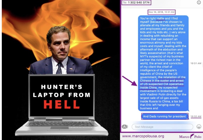 Todos los mensajes de texto de Hunter Biden que se encuentran en su ordenador portátil, incluidos los que aparecen en este artículo, se pueden encontrar compilados en un pdf de 888 páginas que se puede buscar en el sitio web de Marco Polo.