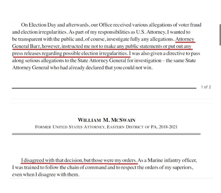 Nos enteramos en el verano de 2021 de que el ex Fiscal General de los Estados Unidos Bill Barr ordenó al Fiscal de los Estados Unidos en el este de Pensilvania que dejara de investigar los problemas de las elecciones de 2020 en el estado y entregara cualquier problema al Fiscal General Demócrata de Pensilvania. Esto habría incluido los informes de aproximadamente 288.000 papeletas que entran en Pensilvania en un semirremolque de Nueva York.