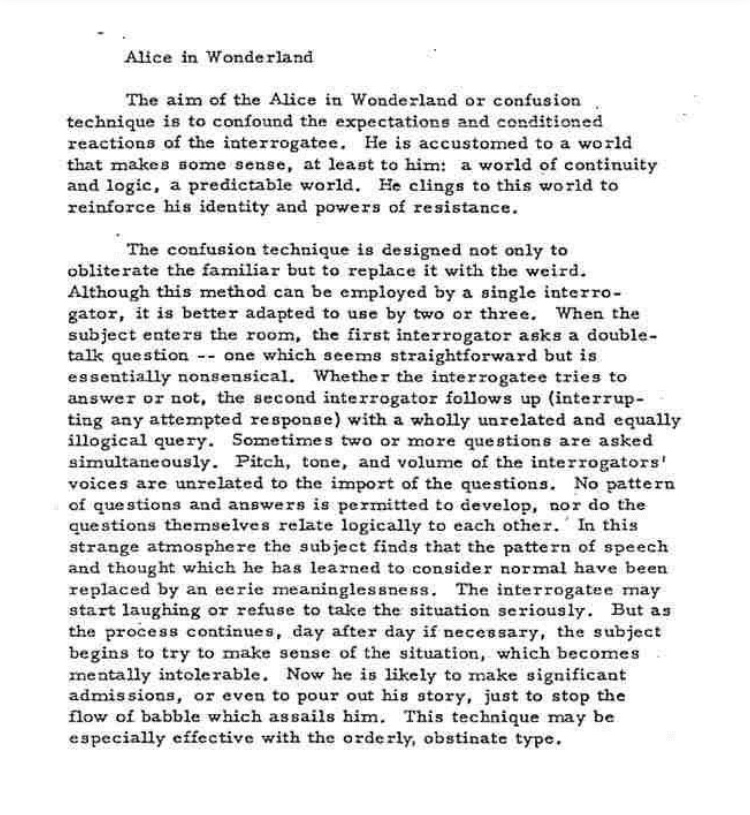 Originalmente diseñado como un programa para ser utilizado con fines de interrogatorio, el programa MK-ULTRA siguió muchas de las directrices enumeradas en el Manual de Interrogatorio de Kubark desclasificado, que enumera un método de interrogatorio conocido como el método «Alicia en el País de las Maravillas». El método implica una técnica de confusión para separar al entrevistado de la realidad.