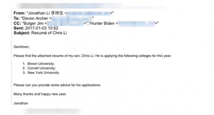 “Gentlmen[sic], por favor encuentren el currículum adjunto de mi hijo, Chris Li. Está aplicando los siguientes colegios para este año», escribe Li, enumerando la Universidad Brown, la Universidad de Cornell y la Universidad de Nueva York.