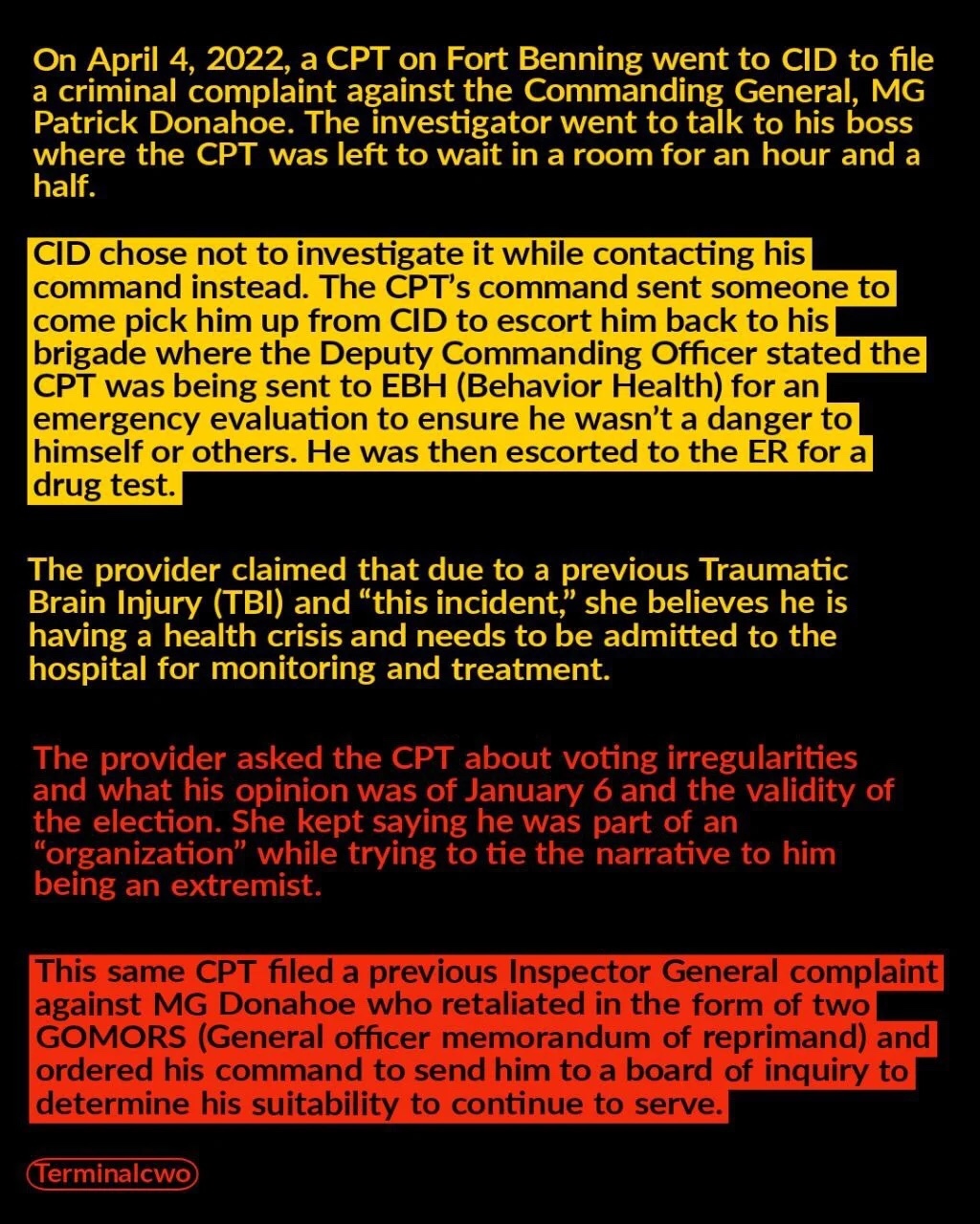 Un capitán que presentó cargos penales contra el comandante general Patrick Donahoe de Fort Benning fue admitido en el hospital de Fort Benning por lo que consideran una «crisis de salud». https://t.me/QAnons_Espana