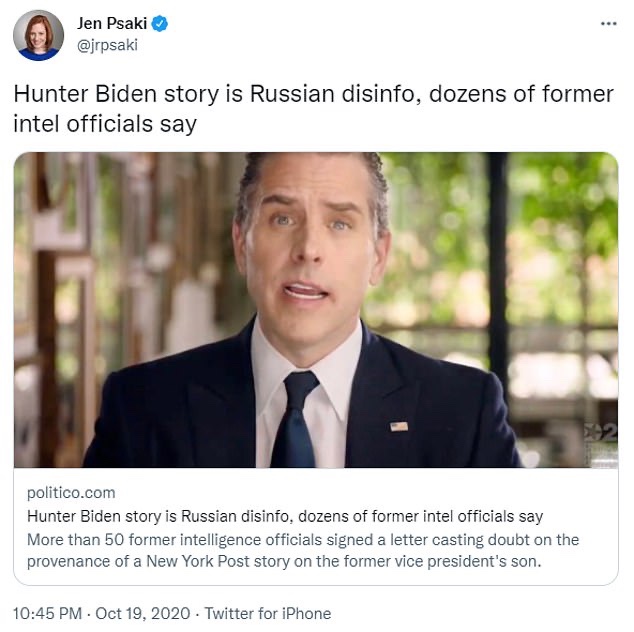 Más de 50 altos exfuncionarios de inteligencia escribieron una carta abierta poniendo en duda la procedencia del portátil en octubre de 2020, afirmando que «tiene todas las marcas clásicas de una operación de información rusa».