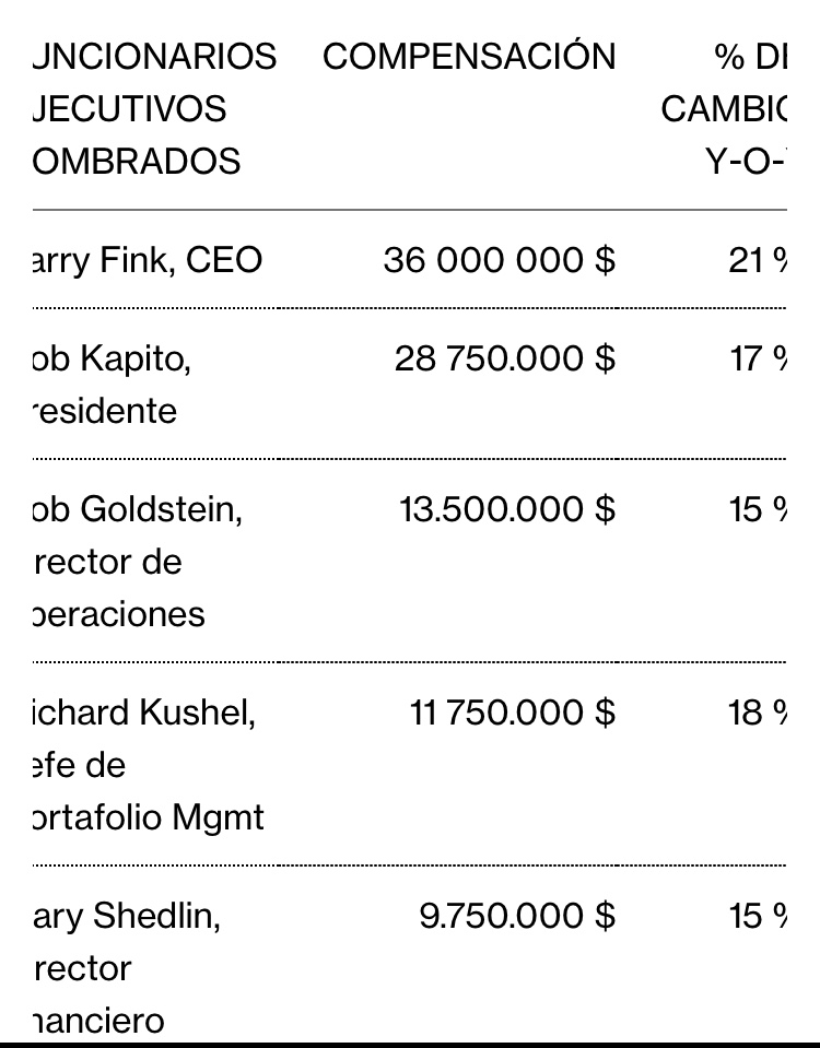 BlackRock Inc. elevó el salario total del director ejecutivo Larry Fink a 36 millones de dólares para 2021, un aumento del 21 % con respecto al año anterior.