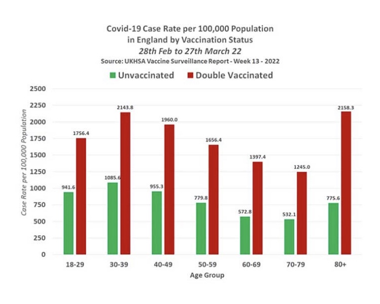 El siguiente gráfico, creado por la Exposición Diaria14, utilizando datos del Informe de Vigilancia de Vacunas de la UKHSA para la semana 13, 202215(páginas 40 y 45), revela quién tiene más probabilidades de contraer COVID. Y la tasa de infección para el triple-vaxxed es incluso más alta que la del doble vaxxed.