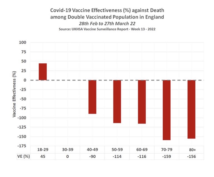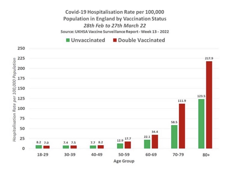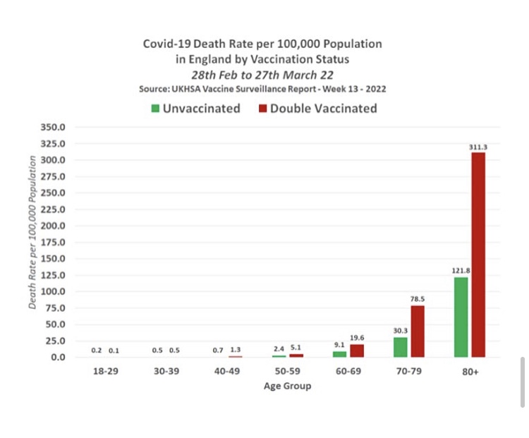 Y, por último, hay una comparación de las tasas de mortalidad, basada en las páginas 44 y 45 del Informe de Vigilancia de Vacunas de la UKHSA para la semana 13, 2022.17 Cualquier persona mayor de 40 años que haya sido doblemente golpeada ahora tiene más probabilidades de morir de COVID que una persona no vacunada de la misma edad.