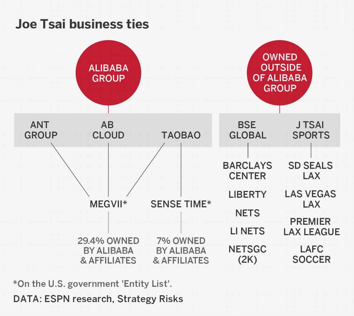 Un examen de ESPN del historial de Tsai, y las inversiones en China de los principales propietarios de los 30 equipos de la NBA, muestra cómo las ambiciones globales de la liga entran en conflicto con su compromiso con la justicia social. En 2019, un tuit a favor de la democracia del entonces gerente general de los Rockets, Daryl Morey, expuso las minas terrestres políticas que enfrenta la liga mientras navega por la tensión entre valor y valores.