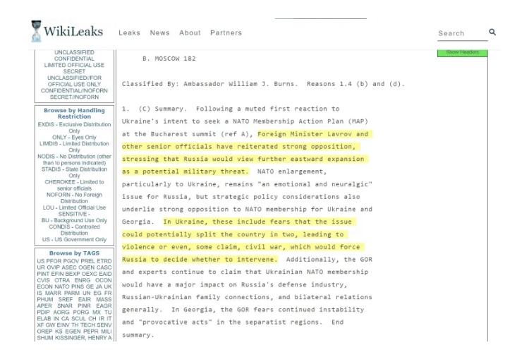 En 2008, cuando se desempeñó como embajador de los Estados Unidos en Rusia, Burns publicó un cable confidencial de embajada en el que advertía que la expansión de la OTAN a Ucrania cruzaría las «líneas rojas» de seguridad de Moscú y «podría dividir el país en dos, lo que llevaría a la violencia o incluso, según algunos afirman, a una guerra civil, lo que obligaría a Rusia a decidir si intervenir o no».