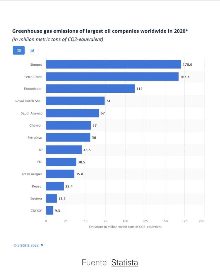 En total, el Grupo Sinopec produjo 343 millones de toneladas de CO2 equivalente durante 2020 y 2021, lo que supuso más emisiones de dióxido de carbono que BP, Chevron y Saudi Aramco combinados.