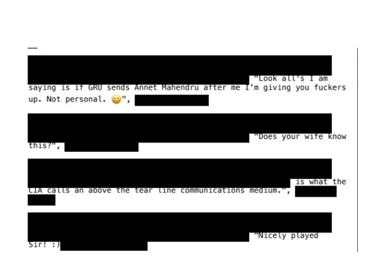 Si bien el correo electrónico de DARPA del 25 de septiembre de 2018 a Antonakakis sobre su «gran trabajo» con respecto al «caso Mueller» no menciona el hackeo de DNC, un «registro de chat» para el proyecto DARPA Rhamnousia muestra a los investigadores de Georgia Tech discutiendo tanto el hackeo de DNC como el GRU. Un texto dice: «Para que el FBI avise al DNC en otoño de 2015, esto significa que el ataque estuvo activo durante muchos meses antes». En otro mensaje, uno de los investigadores bromea diciendo que si GRU envía a la belleza rusa Annet Mahendru tras él, está «renunciando» a sus colegas.