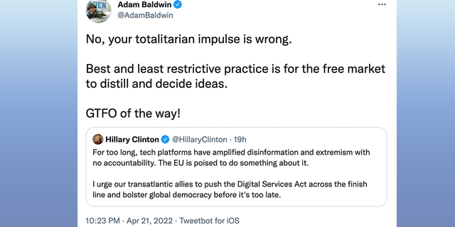El actor Adam Baldwin mencionó el «impulso tiránico» de Hillary, tuiteando: «No, tu impulso totalitario está equivocado. La mejor y menos restrictiva práctica es que el libre mercado destile y decida ideas. ¡GTFO del camino!»