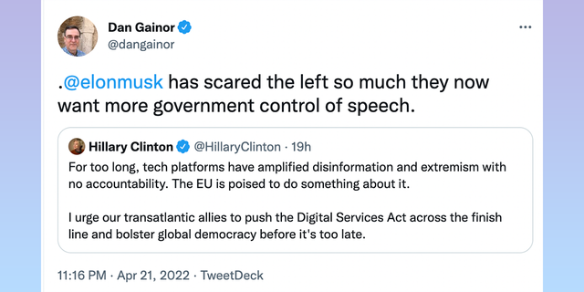 El vicepresidente de Libertad de Expresión América y Negocios del Centro de Investigación de Medios, Dan Gainor, estableció una conexión con la reacción a la oferta de Elon Musk de comprar Twitter, tuiteando: «@elonmusk ha asustado tanto a la izquierda que ahora quieren más control gubernamental de la voz».