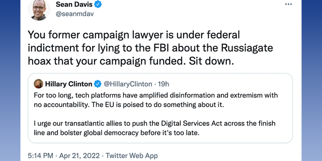 Los usuarios conservadores de Twitter mostraron total desdén por el tuit de Clinton el viernes, recordándole que ella era parte del esfuerzo por vincular al expresidente Trump al «engaño» de la Colusión de Rusia. También la acusaron de querer «controlar» el discurso y de tener un «impulso totalitario».