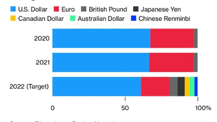 Para adaptarse a los cambios, la participación del euro caerá al 20%, la más baja en al menos una década, desde poco más del 30%, mientras que el dólar representará el 61%, frente al 66,5%. La ponderación de la libra, por el contrario, casi se duplicará al 5%, volviendo a un nivel visto por última vez en 2011. https://t.me/QAnons_Espana