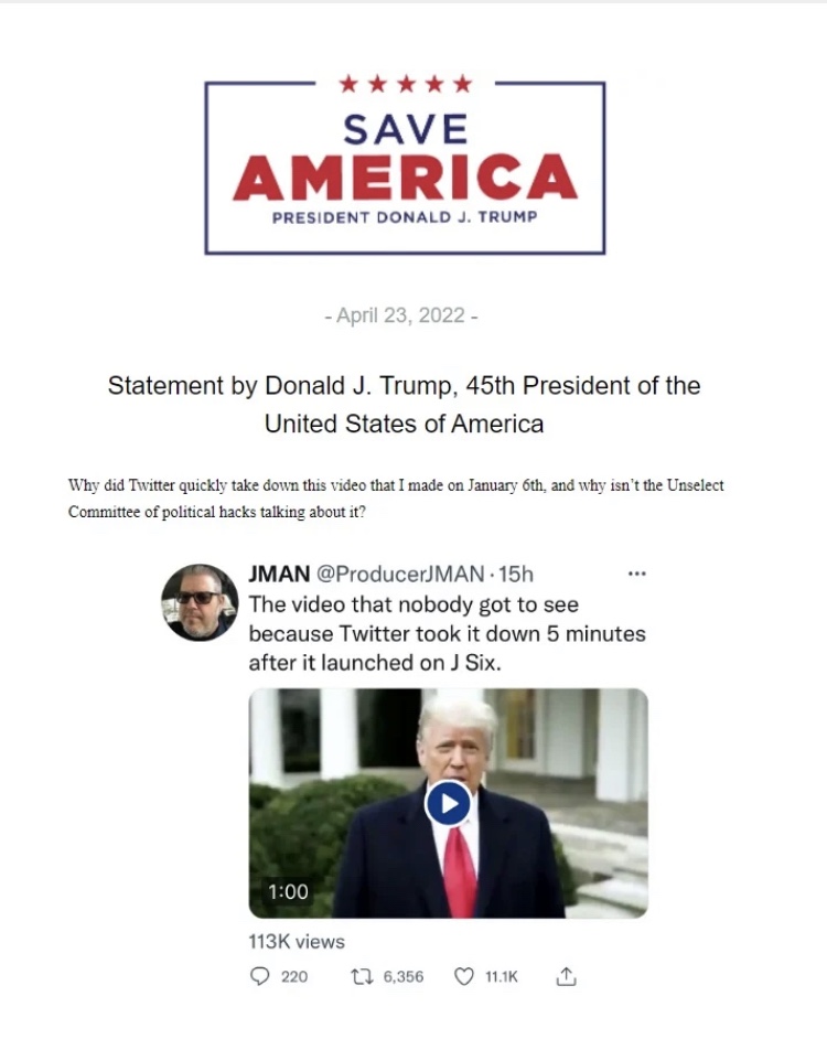El presidente Trump recordó al mundo de hoy el tuit que compartió el 6 de enero que Twitter se derribó cinco minutos después de que se compartiera. En él, el presidente pidió a sus seguidores que se fueran a casa pacíficamente.