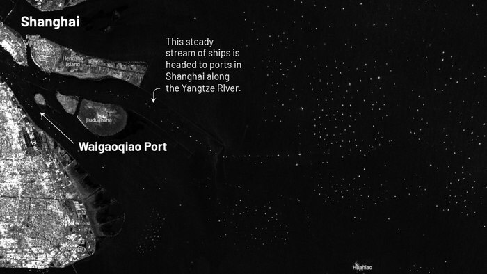 Aquí hay una mirada más cercana a las imágenes satelitales capturadas por el satélite Sentinel-1, que muestra la congestión actual en el puerto de Shanghái a partir del 14 de abril de 2022. En la imagen, la mayoría de los puntos blancos son buques de carga, muchos de los cuales tienen estado atrapado en el limbo durante días.