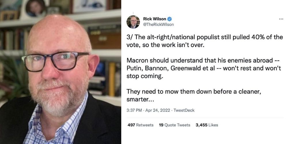 En un hilo de Twitter que discutía los resultados de las elecciones presidenciales francesas, el deshonrado cofundador del Proyecto Lincoln, Rick Wilson, pidió a la gente que «derribara» al periodista Glenn Greenwald y al exasesor de Trump Steve Bannon.