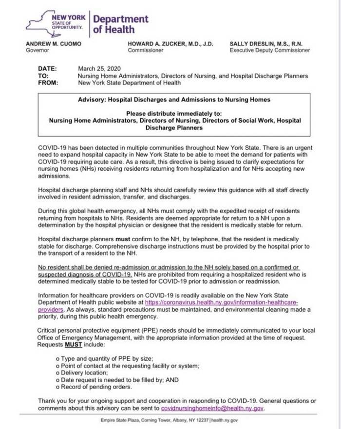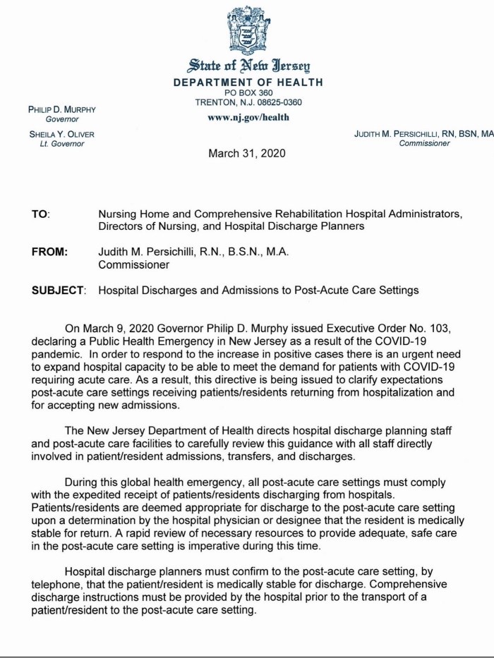 En agosto de 2020, el Departamento de Justicia solicitó datos a cuatro gobernadores demócratas sobre sus órdenes de enviar pacientes enfermos con COVID-19 a hogares de ancianos.