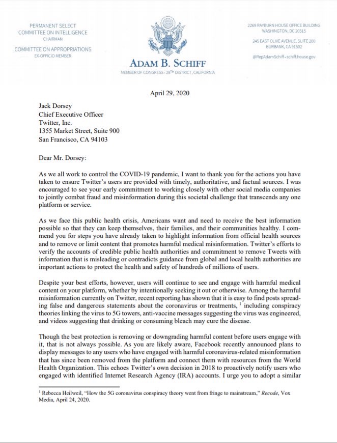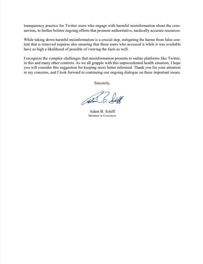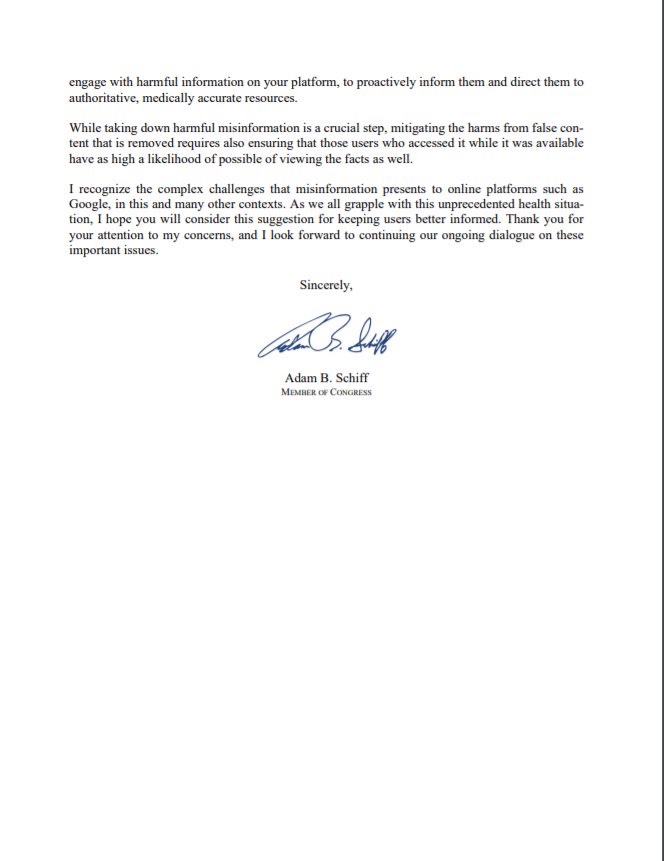 Schiff envió estas cartas a Google, YouTube y Twitter.